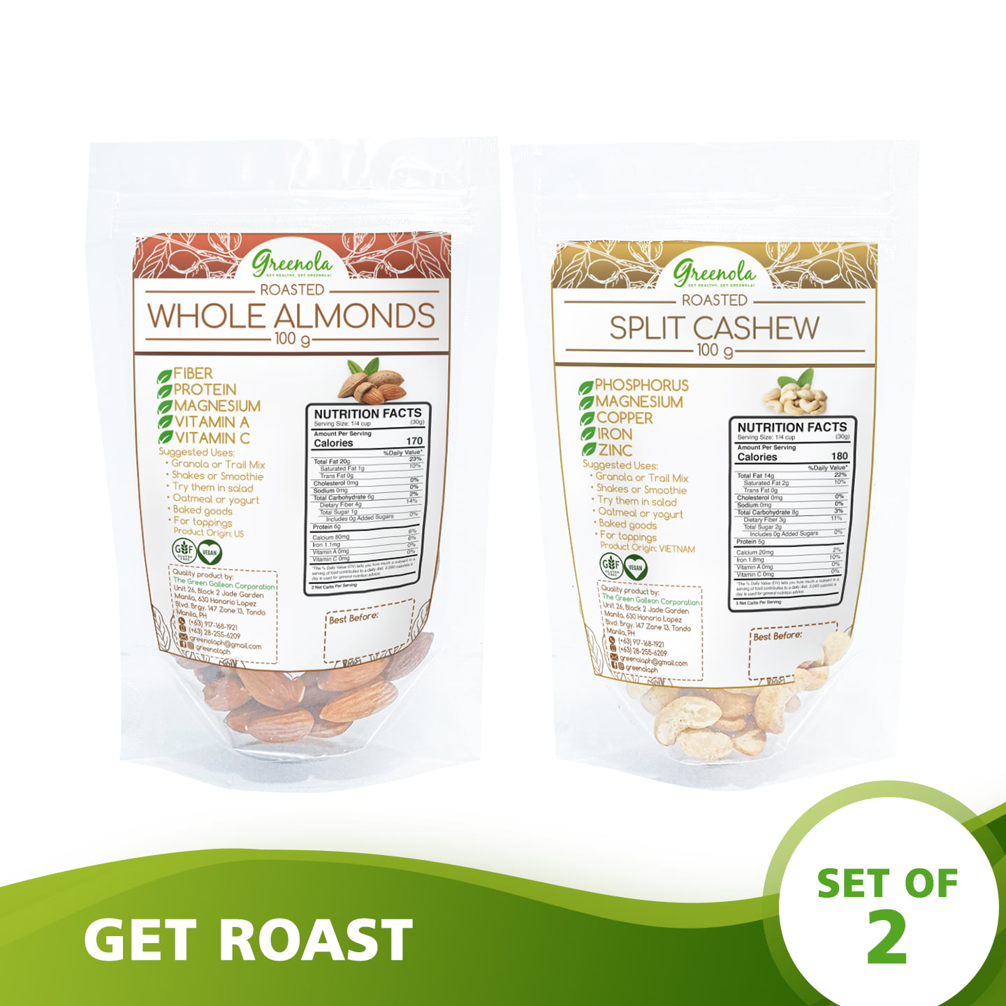This set contains Greenola Almond (Roasted, Whole) 100g + Greenola (Roasted, Split) 100g.