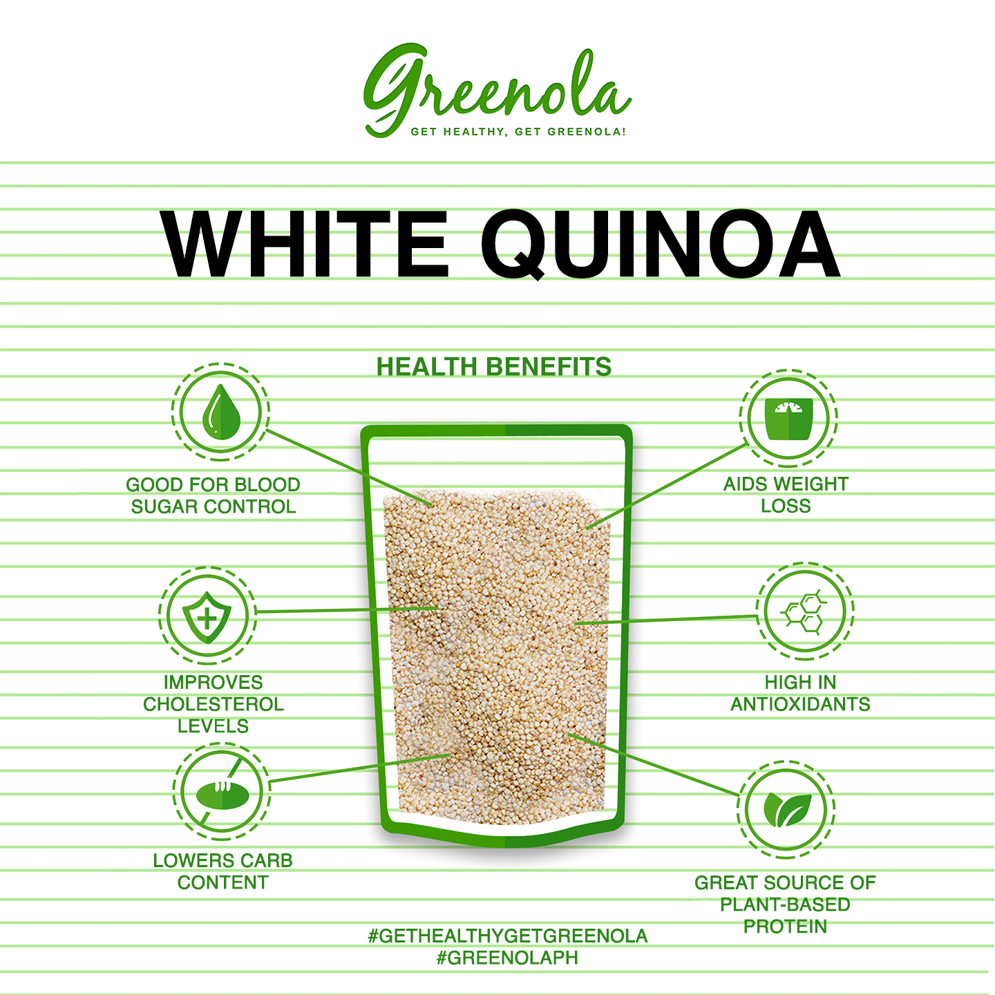 - Quinoa (White, Organic) – Good for blood sugar control; improves cholesterol levels; lowers carb content compared to rice; high in antioxidants; great source of plant-based protein.